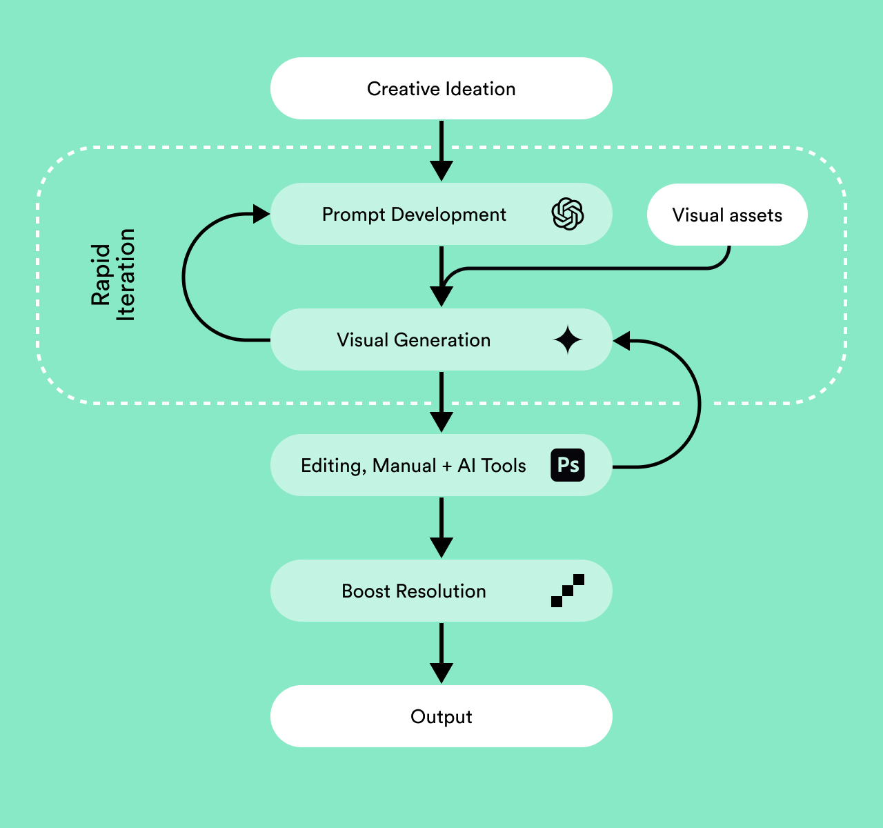 - Refinement - Assets cycle between AI generation and Photoshop editing, allowing ideas to evolve through multiple passes until the desired result is achieved.